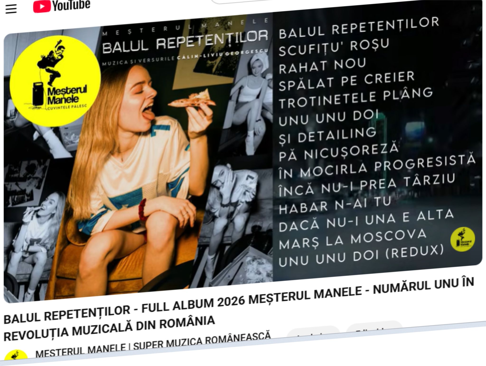 BALUL REPETENȚILOR, noul album LP de la Meșterul Manele este acum pe YouTube și oferă fabuloșilor ascultători ai fenomenului muzical-satiric Meșterul Manele peste o oră de vindecări și purificări dansante, efectiv, o adevărată sesiune de exorcism politic și progresist. Pacienții au raportat succese. Ceea ce vă doresc și dumneavoastră. Link în comments.