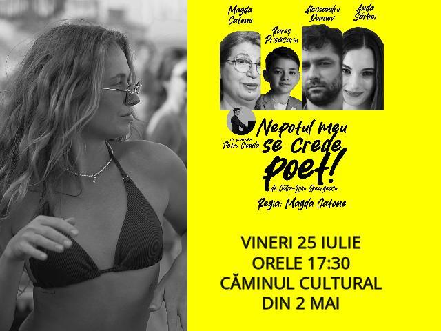 Cine este în 2 Mai sau merge în 2 Mai, vineri, 25 iulie, poate avea deosebit de rara plăcere de a combina litoralul cu teatrul și de a intra la piesa mea ”Nepotul meu se crede poet” în regia Magdei Catone, care se joacă într-o unică reprezentație estivală, în penultima zi a Festivalului de Teatru și Film ”Șerban Ionescu” (19-26 Iulie), cu distribuția de la premieră, dar bronzată: măreața Magda Catone, fenomenalul copil Rareș Prisacariu, fascinanta Anda Sârbei și mult admiratul Alecsandru Dunaev, la care se adaugă, ca noutate, marele pianist Petru Cioacă tocmit să realizeze aranjamentul muzical al piesei, ocazie cu care va include și niște compoziții proprii (cred). Totuși, nu vă lăsați intimidați de prezența unui pianist pe scenă, piesa este o comedie-manifest pentru mai multă poezie în viață și mai puțin mercantilism. Perfectă pentru 2 Mai. Este o idee bună să vă orientați după posterele care vor fi răspândite prin Limanu și 2 Mai ca să luați bilete și așa mai departe. Teatru și plajă. Pentru un 2 Mai și mai și!