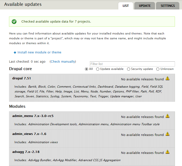 Just figured out how to fix the „No available releases found” in Drupal 7.5x. It’s that error on the updates page where all or almost all modules are grayed out with an exclamation mark.
