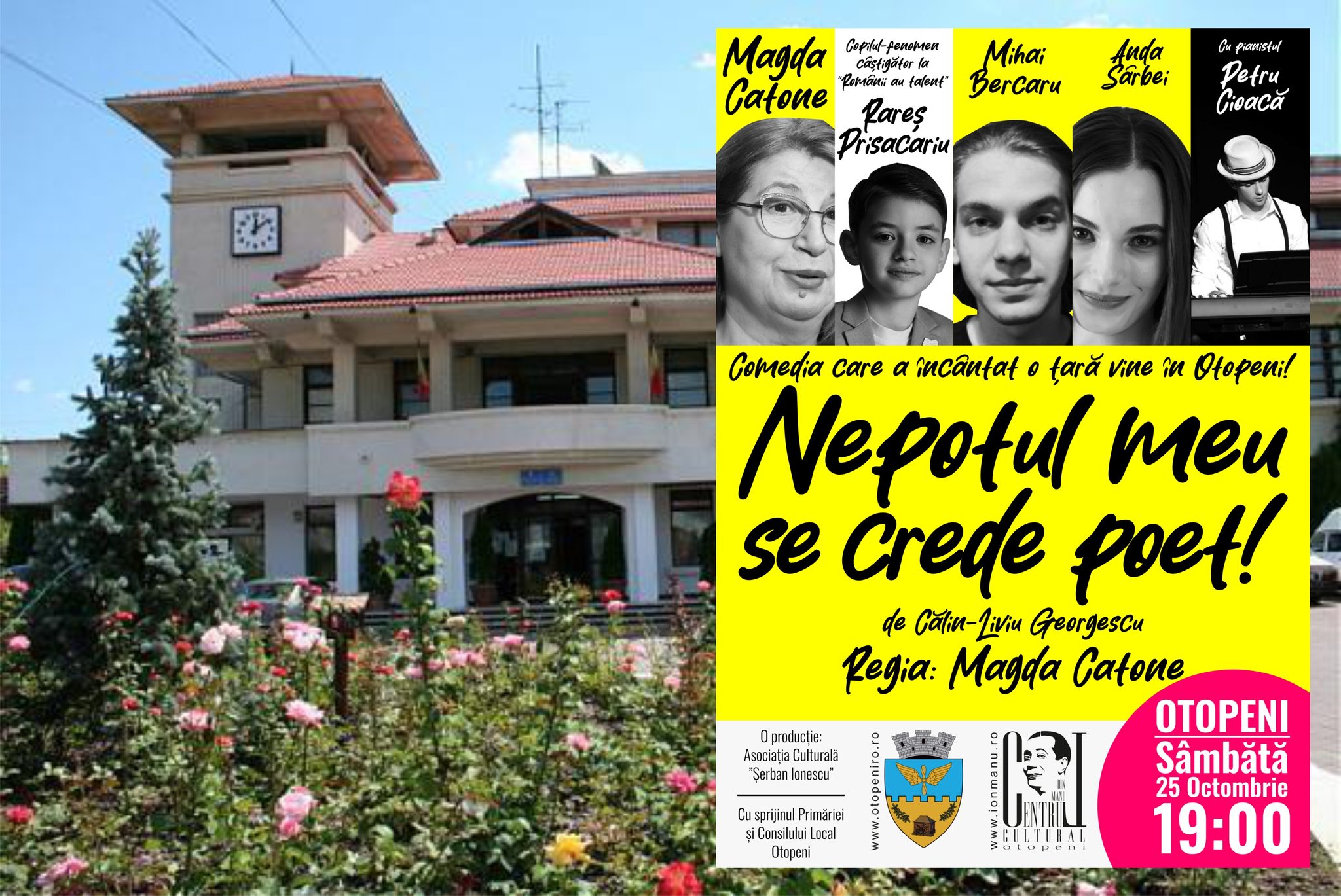 Sâmbăta aceasta, adică peste patru zile, pe 25 octombrie, de la orele 19:00, la Centrul Cultural ”Ion Manu” din buricul orașului Otopeni, Strada 23 August nr. 8 , se joacă piesa mea, ”Nepotul meu se crede poet”, cu Magda Catone, copilul Rareș Prisacariu, Anda Sârbei, Mihai Bercaru și pianistul Petru Cioacă. Piesa este o meserie de comedie cu miez, cu râs la greu, piele de găină și alte atracții de weekend.