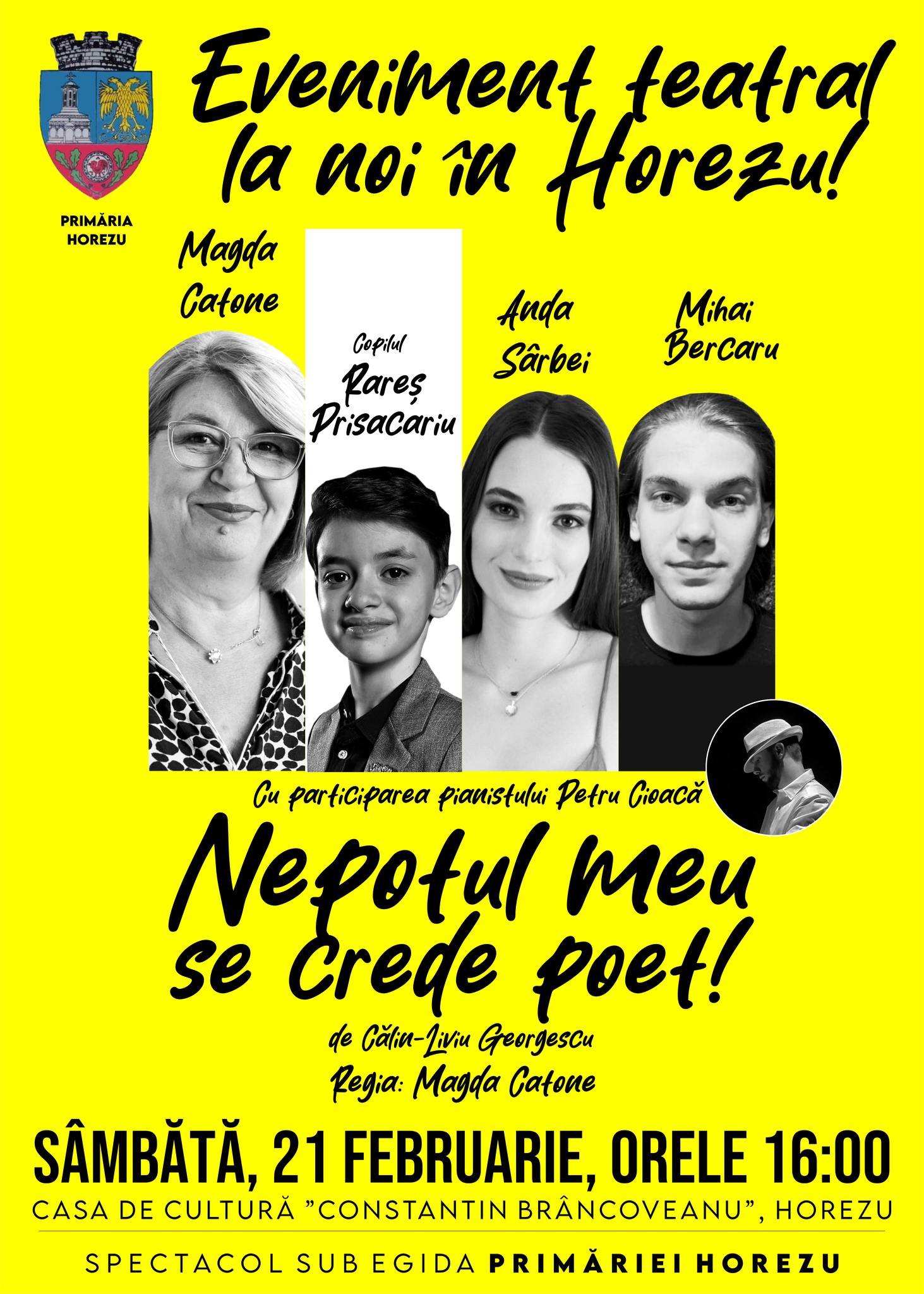 Următoarele spectacole cu piesa mea NEPOTUL MEU SE CREDE POET!, în regia Magdei Catone, cu distribuția de la premieră, Magda Catone, fenomenalul copil Rareș Prisacariu, Alecsandru Dunaev, Anda Sârbei și pianistul Petru Cioacă vor avea loc după cum urmează: